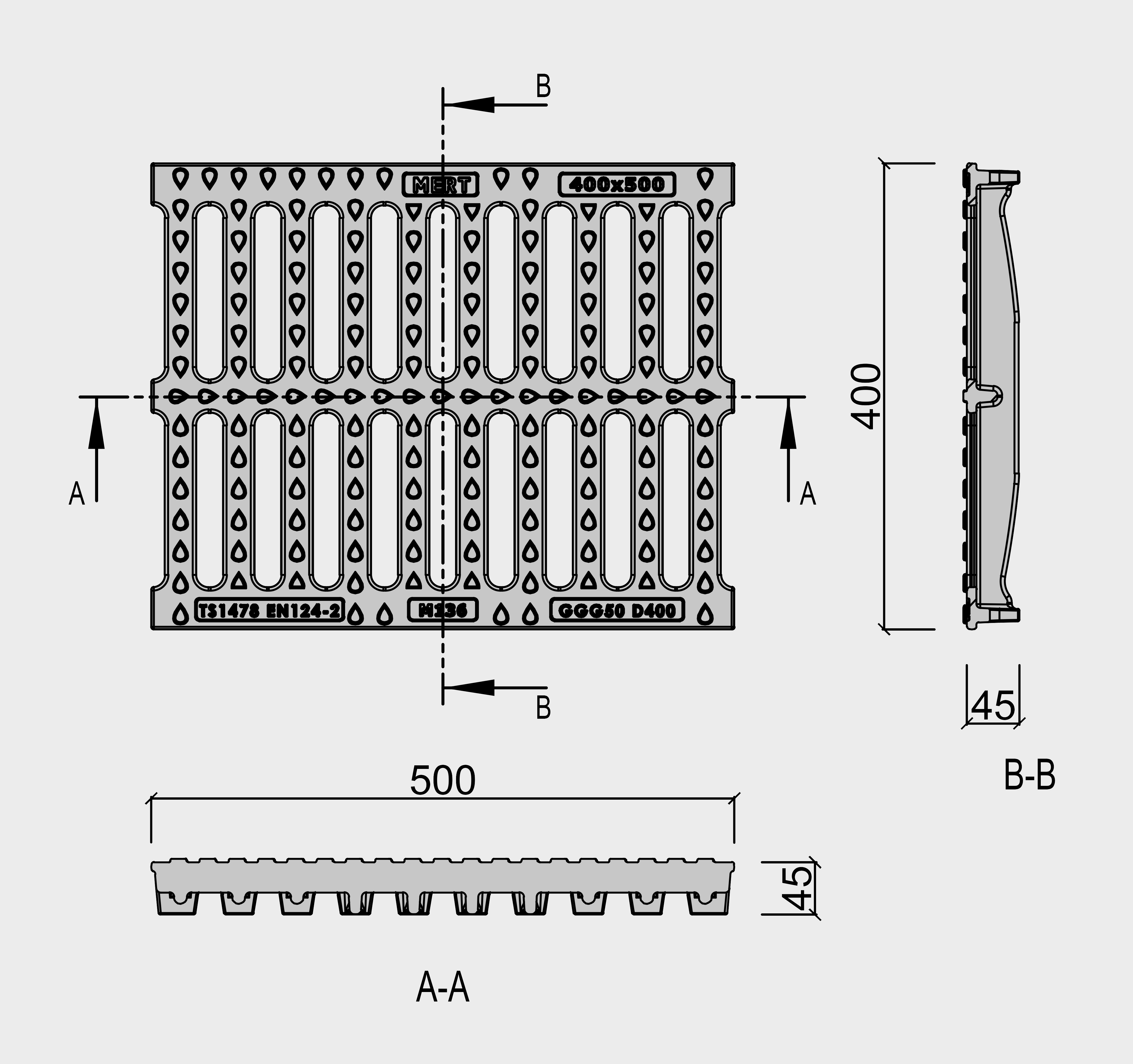 Sfero Döküm Lineer Kanal Izgarası (400mm x 500mm x 45mm) D400