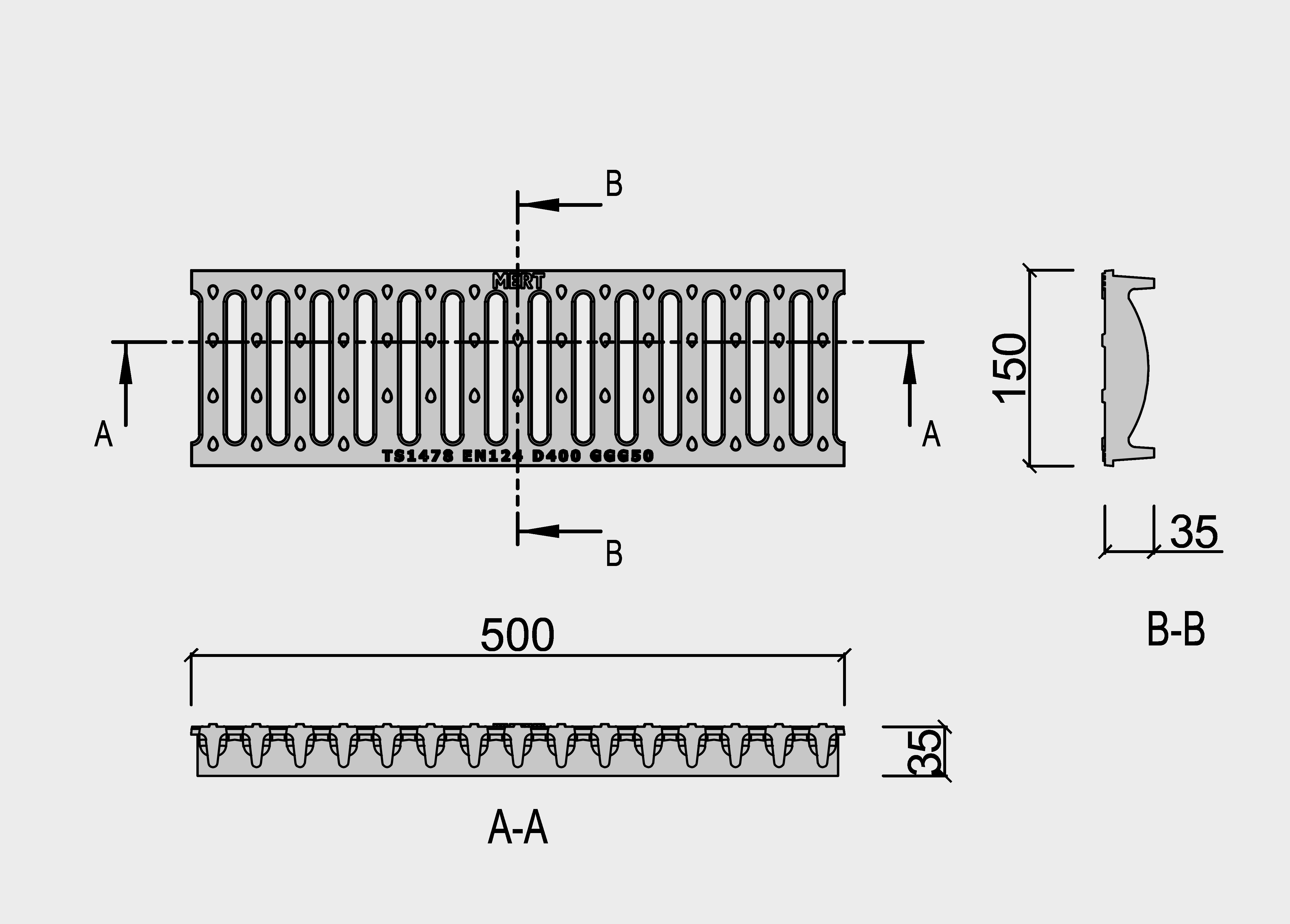 Sfero Döküm Lineer Kanal Izgarası (150mm x 500mm x 35mm) D400
